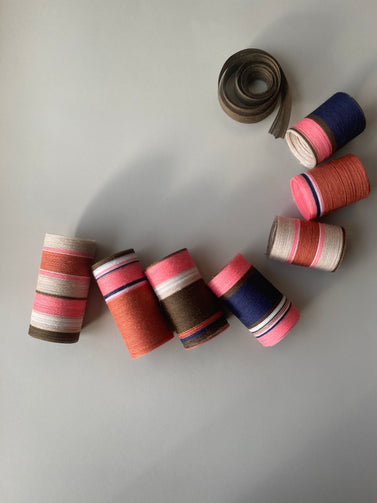 先染めの織物産地ならではの廃材糸を、リボンとして手作業で加工、販売しています。