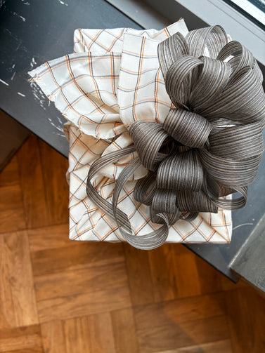 このように大きさも幅も柄もバラバラの、十人十色のリボンが出来上がります。いつも一期一会で、時にはリボンにするには一見個性的すぎるものも出来ますが、それをうまく扱えたときの喜びはひとしお。市販のリボンにはない表情と質感で、ラッピングにオリジナリティをもたらしてくれます。
